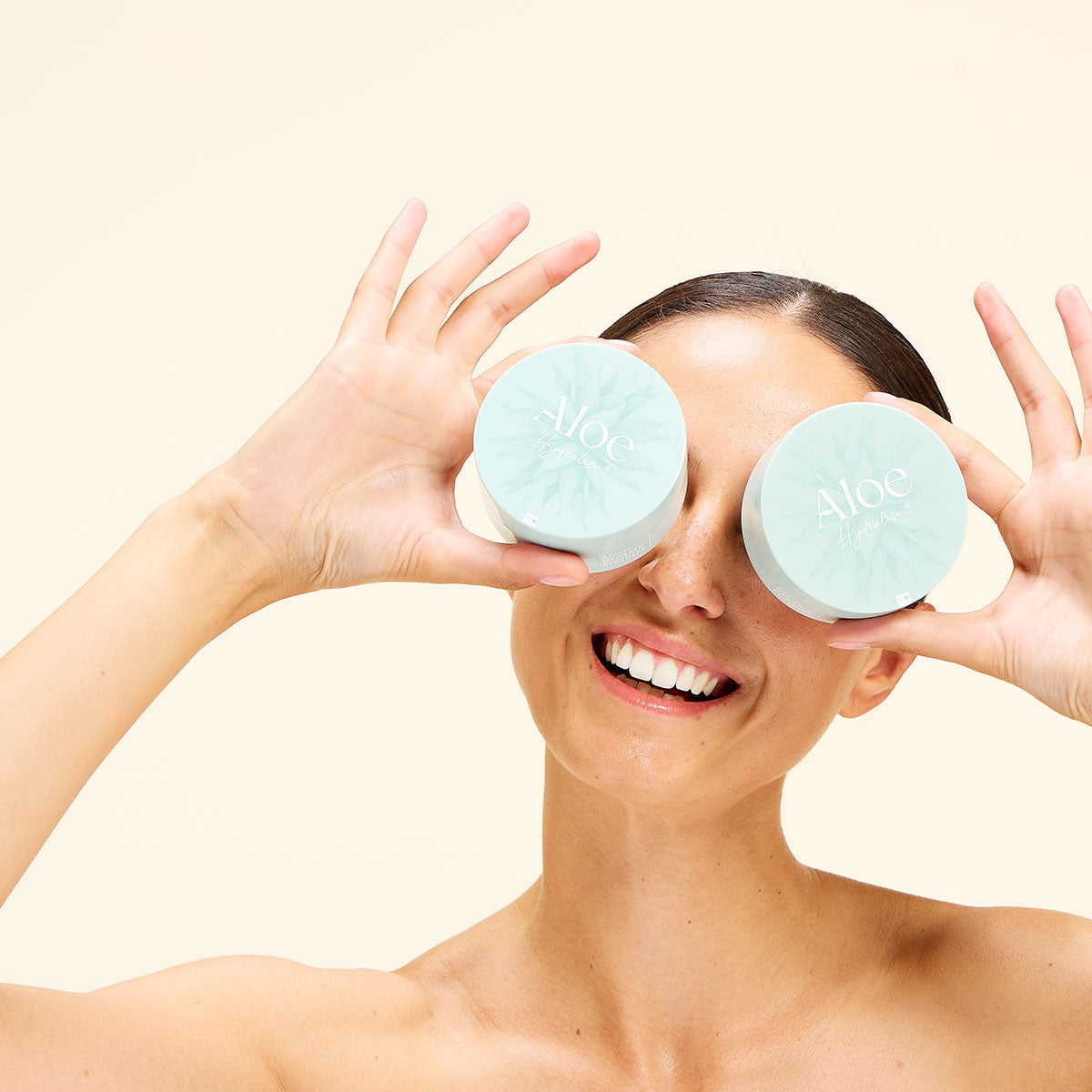 Patchs hydrogel effet frais immédiat. L’acide hyaluronique repulpe, le collagène lisse, les algues drainent et l’Aloe Vera apaise le contour de l’œil.